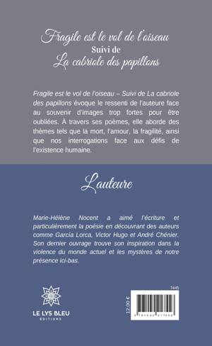 Fragile est le vol de l'oiseau - Suivi de La cabriole des papillons évoque le ressenti de l'auteure face au souvenir d'images trop fortes pour être oubliées. À travers ses poèmes, elle aborde des thèmes tels que la mort, l'amour, la fragilité, ainsi que nos interrogations face aux défis de l'existence humaine.
