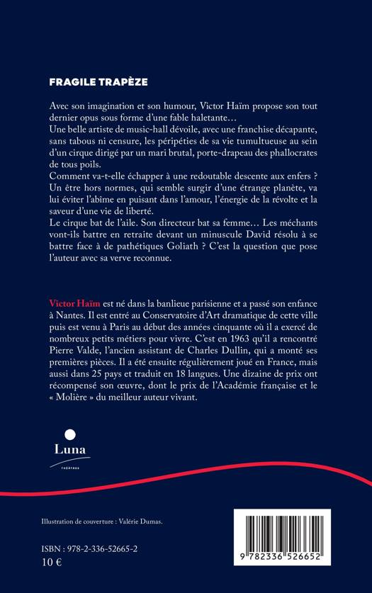 Avec son imagination et son humour, Victor Haïm propose son tout dernier opus sous forme d'une fable haletante... Une belle artiste de music-hall dévoile, avec une franchise décapante, sans tabous ni censure, les péripéties de sa vie tumultueuse au sein d'un cirque dirigé par un mari brutal, porte-drapeau des phallocrates de tous poils. Comment va-t-elle échapper à une redoutable descente aux enfers ? Un être hors normes, qui semble surgir d'une étrange planète, va lui éviter l'abîme en puisant dans l'amour, l'énergie de la révolte et la saveur d'une vie de liberté. Le cirque bat de l'aile. Son directeur bat sa femme... Les méchants vont-ils battre en retraite devant un minuscule David résolu à se battre face à de pathétiques Goliath ? C'est la question que pose l'auteur avec sa verve reconnue.
