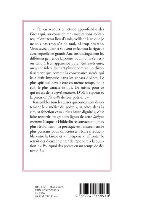 « J'ai eu recours à l'étude approfondie des Grecs qui, au cours de mes méditations solitaires, m'ont tenu lieu d'amis, veillant à ce que je ne sois pas rrop sûr de moi, ni trop hésitant. Vous savez qu'on a souvent méconnu la rigueur avec laquelle les grands Anciens distinguaient les différents genres de la poésie ; du moins s'en est-on tenu à leur apparence purement extérieure, on a considéré leur art plutôt comme un divertissement que comme la convenance sacrée qui leur était imposée dans les choses divines. Le plus spirituel devait être en même temps, pour eux, le plus caractéristique. De même pour ce qui en est de la représentation. D'où la rigueur et la précision formelle de leur poésie... » Rassembler tous les textes qui concernent directement le « métier du poète », sa place dans la cité, sa fonction et sa « plus haute dignité », c'est faire ressortir les grandes lignes de cette logique poétique à laquelle Hôlderlin se consacra toujours plus résolument : la poétique est l'instrument le plus puissant pour caractériser l'écart irréductible entre la Grèce et « l'Hespérie », affronter le retrait des dieux et tenter de répondre à la question : « Pourquoi des poètes en un temps de détresse ? »