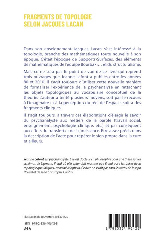 Dans son enseignement Jacques Lacan s'est intéressé à la topologie, branche des mathématiques toute nouvelle à son époque. C'était l'époque de Supports-Surfaces, des éléments de mathématiques de l'équipe Bourbaki... et du structuralisme. Mais ce ne sera pas le point de vue de ce livre qui reprend trois ouvrages que Jeanne Lafont a publiés entre les années 80 et 2010. Il s'agit toujours d'utiliser cette nouvelle manière de formaliser l'expérience de la psychanalyse en rattachant les objets topologiques au vocabulaire conceptuel de la théorie. L'auteur a tenté plusieurs moyens, soit par le recours à l'imaginaire et à la perception du réel de l'espace, soit à des fragments cliniques. Il s'agit toujours, à travers ces élaborations d'élargir le savoir du psychanalyste aux métiers de la parole (travail social, enseignement, psychologie clinique, etc.) et par conséquent aux effets du transfert et de la jouissance. Etre assez précis dans la description de l'acte pour repérer le sien propre dans la cure et ailleurs.