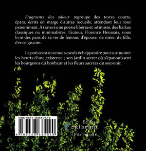 Fragments des adieux regroupe des textes courts, épars, écrits en marge d’autres recueils, attendant leur tour patiemment. À travers une poésie libérée et intimiste, des haïkus classiques ou minimalistes, l’auteur, Florence Houssais, nous livre des pans de sa vie de femme, d’épouse, de mère, de fille, d’enseignante.