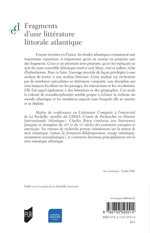 Encore récentes en France, les études atlantiques connaissent une importante expansion, si importante qu'on ne saurait en proposer que des fragments. Ceux-ci ne prennent sens pourtant, qu'en les replaçant au sein du vaste ensemble Atlantique nord et sud, blanc, noir et indien, riche d'hybridations. Pour ce faire, l'ouvrage procède de façon privilégiée à une analyse de textes, à une analyse littéraire. Cette analyse est orchestrée par de nombreux spécialistes en littérature comparée, une discipline qui s'est toujours focalisée sur les passages, les interactions et les circulations.