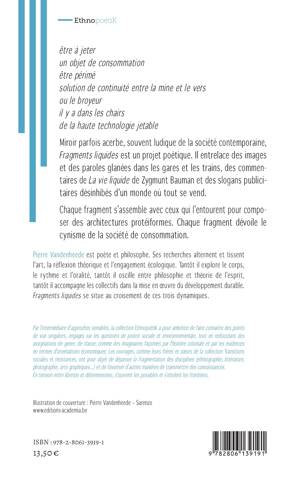 Miroir parfois acerbe, souvent ludique de la société contemporaine, Fragments liquides est un projet poétique. Il entrelace des images et des paroles glanées dans les gares et les trains, des commentaires de La vie liquide de Zygmunt Bauman et des slogans publicitaires désinhibés d'un monde où tout se vend. Chaque fragment s'assemble avec ceux qui l'entourent pour composer des architectures protéiformes. Chaque fragment dévoile le cynisme de la société de consommation.