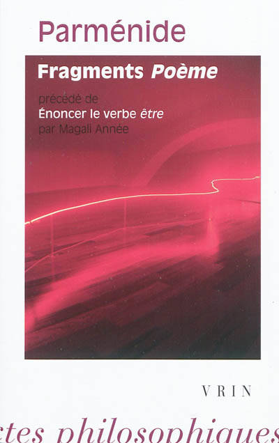 S'installant dans la couche linguistique et poetique sous-jacente du discours de Parmenide, le commentaire de Magali Annee, Enoncer le verbe etre, est resolument linguistique et laisse donc de cote toutes considerations metaphysiques , aussi bien purement ontologiques que logico-ontologiques. Poete authentique, directement relie a l'ensemble de la poesie grecque archaique caracterisee par l'oralite de ses performances, Parmenide elabore une unite linguistique tres particuliere, le verbe etre, dont la forme la plus eminemment representative est oT, est . C'est sur lui que repose l'efficacite de la parole kosmologique du poete-savant.