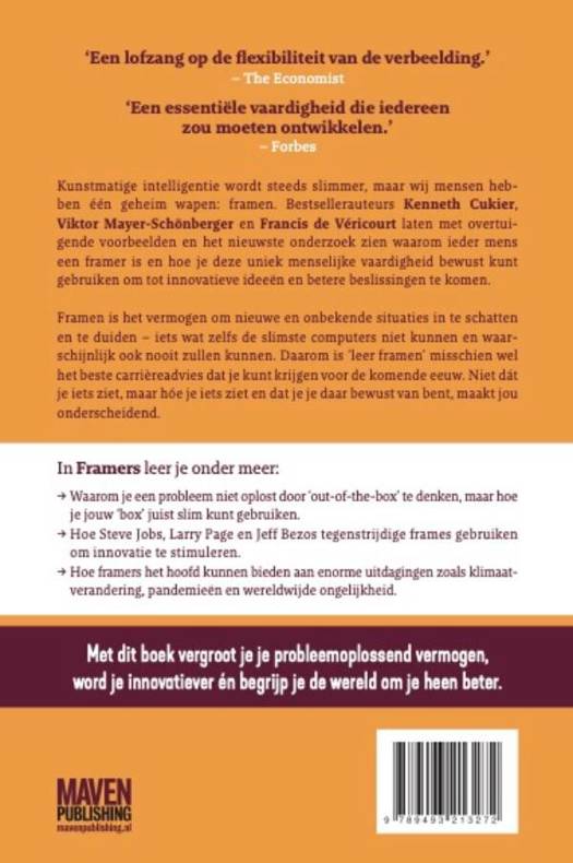 Kunstmatige intelligentie wordt steeds slimmer, maar wij mensen hebben één geheim wapen: framen. Bestsellerauteurs Kenneth Cukier, Viktor Mayer-Schönberger en Francis de Véricourt laten met overtuigende voorbeelden en het nieuwste onderzoek zien waarom ieder mens een framer is en hoe je deze uniek menselijke vaardigheid bewust kunt gebruiken om tot innovatieve en betere beslissingen te komen.