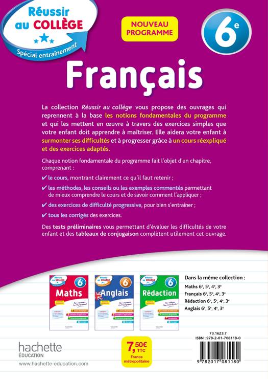 La collection Réussir au collège vous propose des ouvrages qui reprennent à la base les notions fondamentales du programme et qui les mettent en œuvre à travers des exercices simples que votre enfant doit apprendre à maîtriser. Elle aidera votre enfant à surmonter ses difficultés et à progresser grâce à un cours réexpliqué et des exercices adaptés. Chaque notion fondamentale du programme fait l’objet d’un chapitre, comprenant : • le cours, montrant clairement ce qu’il faut retenir ; • les méthodes, les conseils ou les exemples commentés permettant de mieux comprendre le cours et de savoir comment l’appliquer ; • des exercices de difficulté progressive, pour bien s’entraîner ; • tous les corrigés des exercices. Des tests préliminaires vous permettant d’évaluer les difficultés de votre enfant complètent utilement cet ouvrage. À jour des dernières réformes du programme.