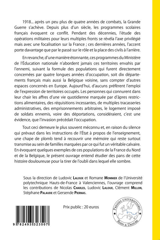 1918... après un peu plus de quatre années de combats, la Grande Guerre s’achève. Depuis plus d’un siècle, les programmes scolaires français évoquent ce conflit. Pendant des décennies, l’étude des opérations militaires pour leurs multiples fronts se révéla l’axe privilégié mais avec une focalisation sur la France ; ces dernières années, l’accent porte davantage que par le passé sur le rôle et la place des civils à l’arrière. En revanche, d’une manière étonnante, ces programmes du Ministère de l’Éducation nationale n’abordent jamais ces territoires envahis par l’ennemi, suivant la formule des populations qui furent directement concernées par quatre longues années d’occupation, soit dix départements français mais aussi la Belgique voisine, sans compter d’autres espaces concernés en Europe. Aujourd’hui, d’aucuns préfèrent l’emploi de l’expression de territoires occupés. Les personnes qui connurent dans leur chair les affres d’une vie quotidienne marquée par d’âpres restrictions alimentaires, des réquisitions incessantes, de multiples tracasseries administratives, des emprisonnements arbitraires, le logement imposé de soldats ennemis, voire des déportations, considéraient, c’est une évidence, que l’invasion précédait l’occupation. Tout ceci demeure le plus souvent méconnu et, en raison du silence qui prévaut dans les instructions de l’État à propos de l’enseignement, une chape de plomb tend à recouvrir une mémoire qui reste surtout transmise au sein de familles marquées par ce qui fut un véritable calvaire. En évoquant quelques exemples de ces populations de la France du Nord et de la Belgique, le présent ouvrage entend étudier des pans de cette histoire douloureuse pour la tirer de l’oubli dans lequel elle sombre.