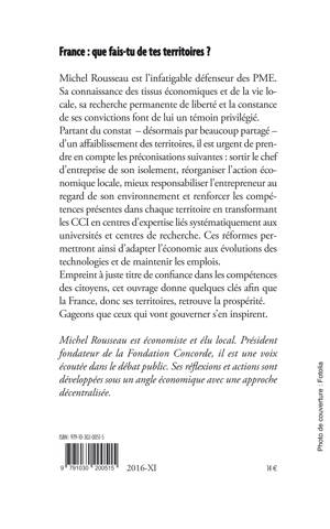 Michel Rousseau est l'infatigable défenseur des PME. Sa connaissance des tissus économiques et de la vie locale, sa recherche permanente de liberté et la constance de ses convictions font de lui un témoin privilégié. Partant du constat - désormais par beaucoup partagé - d'un affaiblissement des territoires, il est urgent de prendre en compte les préconisations suivantes : sortir le chef d'entreprise de son isolement, réorganiser l'action économique locale, mieux responsabiliser l'entrepreneur au regard de son environnement et renforcer les compétences présentes dans chaque territoire en transformant les CCI en centres d'expertise liés systématiquement aux universités et centres de recherche. Ces réformes permettront ainsi d'adapter l'économie aux évolutions des technologies et de maintenir les emplois.