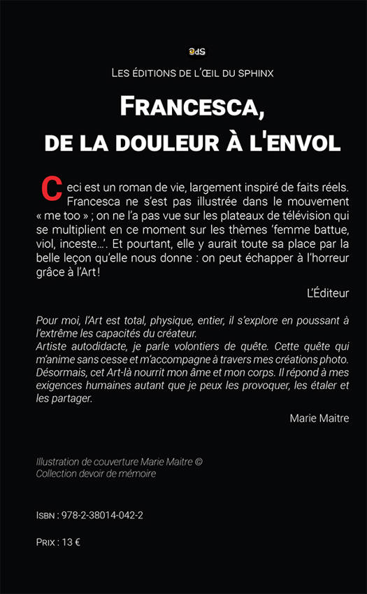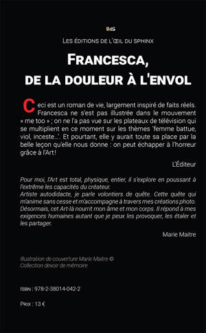 Ceci est un roman de vie, largement inspiré de faits réels. Francesca ne s'est pas illustrée dans le mouvement me too; on ne l'a pas vue sur les plateaux de télévision qui se multiplient en ce moment sur les thèmes 'femme battue, viol, inceste...'. Et pourtant, elle y aurait toute sa place par la belle leçon qu'elle nous donne: on peut échapper à l'horreur grâce à l'Art !