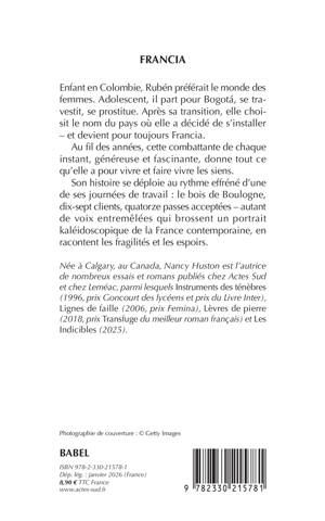 Enfant en Colombie, Rubén préférait le monde des femmes. Adolescent, il part pour Bogotá, se travestit, se prostitue. Après sa transition, elle choisit le nom du pays où elle a décidé de s'installer - et devient pour toujours Francia. Au fil des années, cette combattante de chaque instant, généreuse et fascinante, donne tout ce qu'elle a pour vivre et faire vivre les siens. Son histoire se déploie au rythme effréné d'une de ses journées de travail : le bois de Boulogne, dix-sept clients, quatorze passes acceptées - autant de voix entremêlées qui brossent un portrait kaléidoscopique de la France contemporaine, en racontent les fragilités et les espoirs.