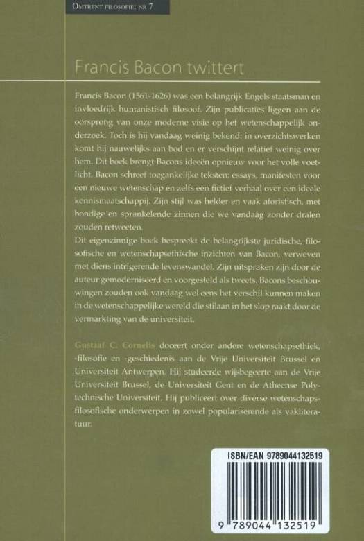 Dit eigenzinnige boek bespreekt de belangrijkste juridische, filosofische en wetenschapsethische inzichten van Bacon, verweven met diens intrigerende levenswandel. Zijn uitspraken zijn door de auteur gemoderniseerd en voorgesteld als tweets. Bacons beschouwingen zouden ook vandaag wel eens het verschil kunnen maken in de wetenschappelijke wereld die stilaan in het slop raakt door de vermarkting van de universiteit.