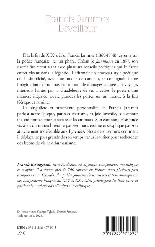 Dès la fin du xixe siècle, Francis Jammes (1865-1938) rayonna sur la poésie française, tel un phare. Créant le Jammisme en 1897, son succès fut retentissant avec plusieurs recueils poétiques qui le firent entrer vivant dans la légende. Il affirmait un nouveau style poétique où la simplicité, avec une touche de naïveté, se conjuguait à une imagination débordante. Par un monde d'images colorées, de voyages intérieurs hantés par la Guadeloupe de ses ancêtres, le poète d'une manière inégalée, ouvre grandes les portes sur un monde à la fois féérique et familier. La singulière et attachante personnalité de Francis Jammes parle à notre époque, par son charisme, sa joie juvénile, son amour inconditionnel pour la nature et les animaux. Son étonnante résistance vis-à-vis du milieu littéraire parisien nous étonne et s'explique par son attachement indéfectible aux Pyrénées. Nous découvrirons comment il déplaça les plus grands de son temps venus le visiter pour rechercher des leçons de vie et d'humanisme.