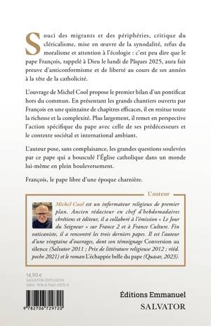 Souci des migrants et des périphéries, critique du cléricalisme, mise en oeuvre de la synodalité, refus du moralisme et attention à l'écologie : c'est peu dire que le pape François, rappelé à Dieu le lundi de Pâques 2025, aura fait preuve d'anticonformisme et de liberté au cours de ses années à la tête de la catholicité. L'ouvrage de Michel Cool propose le premier bilan d'un pontificat hors du commun. En présentant les grands chantiers ouverts par François en une quinzaine de chapitres efficaces, il en resitue toute la richesse et la complexité. Plus largement, il remet en perspective l'action spécifique du pape avec celle de ses prédécesseurs et le contexte sociétal et international ambiant. L'auteur pose, sans complaisance, les grandes questions soulevées par ce pape qui a bousculé l'Église catholique dans un monde lui-même en plein bouleversement. François, le pape libre d'une époque charnière. Michel Cool est un informateur religieux de premier plan. Ancien rédacteur en chef d'heb