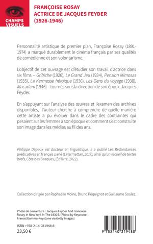 Personnalité artistique de premier plan, Françoise Rosay (1891-1974) a marqué durablement le cinéma français par ses qualités de comédienne et son volontarisme. L'objectif de cet ouvrage est d'étudier son travail d'actrice dans six films - Gribiche (1926), Le Grand Jeu (1934), Pension Mimosas (1935), La Kermesse héroïque (1936), Les Gens du voyage (1938), Macadam (1946) - tournés sous la direction de son époux, Jacques Feyder. En s'appuyant sur l'analyse des oeuvres et sur l'examen des archives disponibles, on se propose ici d'essayer de comprendre de quelle manière cette artiste a pu évoluer dans le cadre des contraintes qui pesaient sur les femmes à son époque et comment s'est construite son image dans les médias au fil des ans.