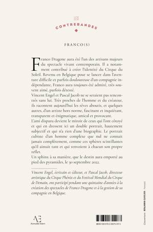 Franco Dragone aura été l'un des artisans majeurs du spectacle vivant contemporain. Il a notamment contribué à créer l'identité du Cirque du Soleil. Revenu en Belgique pour se lancer dans l'aventure difficile et parfois douloureuse d'un compagnie indépendante, Franco aura toujours été admiré, très souvent aimé, parfois détesté. Vincent Engel et Pascal Jacob ne se seraient pas rencontrés sans lui. Très proches de l'homme et du créateur, ils racontent aujourd'hui les rêves aboutis, et quelques autres, d'un artiste hors norme, fascinant et inquiétant, transparent et énigmatique, amical et provocant. L'ami disparu devient le miroir de ceux qui l'ont côtoyé et qui en dressent ici un double portrait, hautement subjectif et qui n'a rien d'une biographie. Le portrait cubiste d'un homme complexe que nul ne connaître jamais complètement, comme ces sphères scintillantes qu'il aimait tant et qui renvoient à chacun son propre reflet. Un sphinx à sa manière, que le destin aura emporté au pied des pyramides, le 30 septembre 2022.