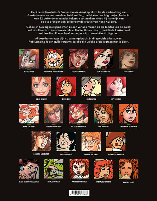 Verzamelaar Rob Lamping begon in 2020 aan een bijzonder project. Als ode aan de Franka tweeluik De tanden van de draak en De ondergang van de Donderdraak vroeg hij 20 strip-tekenaars om een van de covers te hertekenen in hun eigen stijl. Het resultaat is verbluffend, en wilde Rob niet alleen voor zichzelf houden. Vandaar deze bundeling van de bijdrages van o.a. Henk Kuijpers, Eric Heuvel, Kristof Spaey, Romano Molenaar, Hans van Oudenaarden, Kim Duchateau, Danker Jan Oreel, IJsbrand Oost, Dick Heins e.v.a.