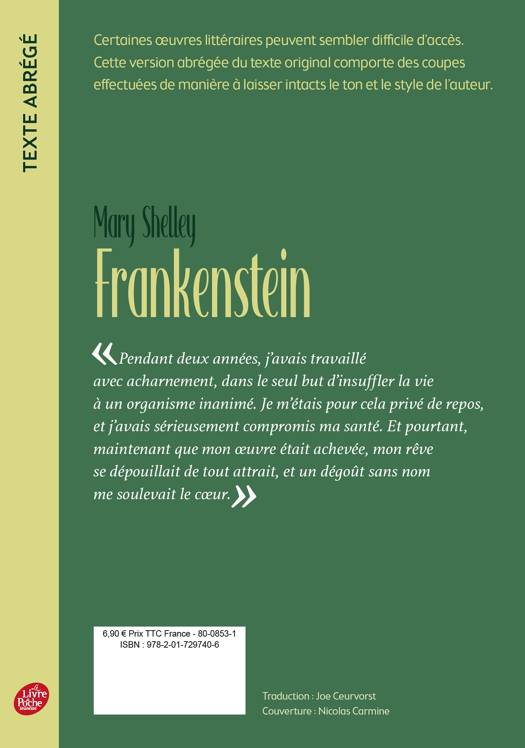Extrait : « Pendant deux années, j'avais travaillé avec acharnement, dans le seul but d'insuffler la vie à un organisme inanimé. Je m'étais pour cela privé de repos, et j'avais sérieusement compromis ma santé. Et pourtant, maintenant que mon oeuvre était achevée, mon rêve se dépouillait de tout attrait, et un dégoût sans nom me soulevait le coeur. »