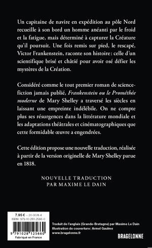 Cette édition est proposée dans une nouvelle traduction, réalisée à partir de la version originelle de Mary Shelley parue en 1818, et non la version retouchée de 1831, plus répandue.