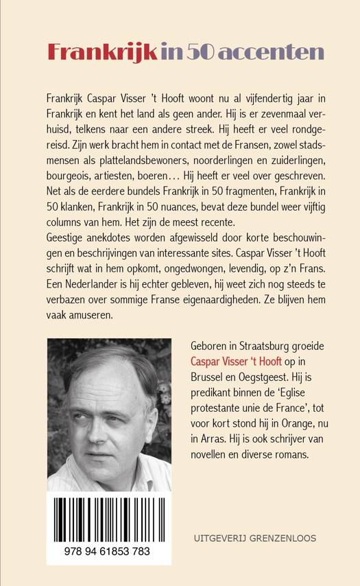 Frankrijk Caspar Visser ’t Hooft woont nu al vijfendertig jaar in Frankrijk en kent het land als geen ander. Hij is er zevenmaal verhuisd, telkens naar een andere streek. Hij heeft er veel rondgereisd. Zijn werk bracht hem in contact met de Fransen, zowel stadsmensen als plattelandsbewoners, noorderlingen en zuiderlingen, bourgeois, artiesten, boeren… Hij heeft er veel over geschreven. Net als de eerdere bundels Frankrijk in 50 fragmenten, Frankrijk in 50 klanken, Frankrijk in 50 nuances, bevat deze bundel weer vijftig columns van hem. Het zijn de meest recente.