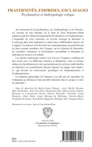 Cet ouvrage envisage la fraternité et l'esclavage dans leurs antinomies et dans leurs conflictualités étayées sur l'emprise. Les auteurs interrogent comme voie d'accès, l'emprise, condition du lien social, avec ses différentes attaches et aliénations. La tentation primordiale de l'humain n'est-elle pas de reproduire de l'inhumain au détriment d'une possible fraternité dans le groupe et entre les individus ?