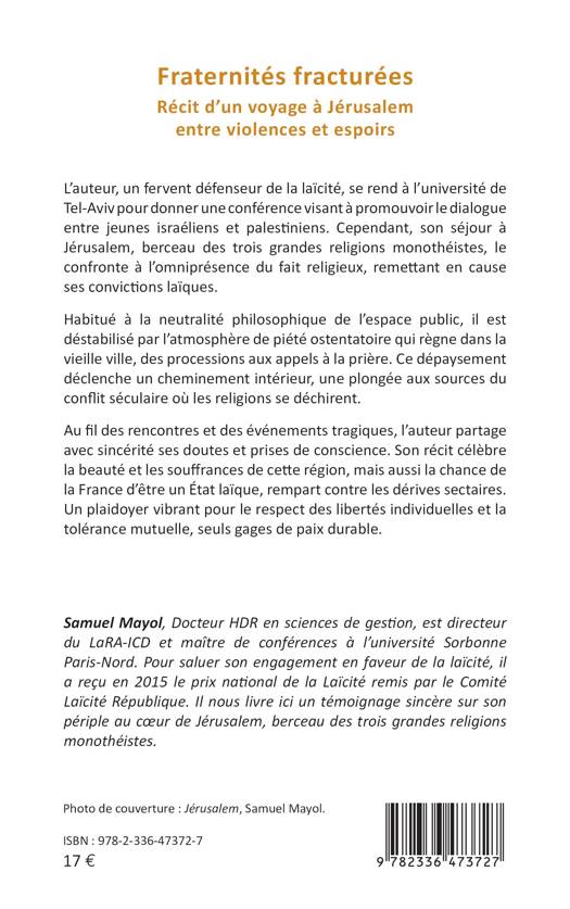 L’auteur, un fervent défenseur de la laïcité, se rend à l’université de Tel-Aviv pour donner une conférence visant à promouvoir le dialogue entre jeunes israéliens et palestiniens. Cependant, son séjour à Jérusalem, berceau des trois grandes religions monothéistes, le confronte à l’omniprésence du fait religieux, remettant en cause ses convictions laïques. Habitué à la neutralité philosophique de l’espace public, il est déstabilisé par l’atmosphère de piété ostentatoire qui règne dans la vieille ville, des processions aux appels à la prière. Ce dépaysement déclenche un cheminement intérieur, une plongée aux sources du conflit séculaire où les religions se déchirent. Au fil des rencontres et des événements tragiques, l’auteur partage avec sincérité ses doutes et prises de conscience. Son récit célèbre la beauté et les souffrances de cette région, mais aussi la chance de la France d’être un État laïque, rempart contre les dérives sectaires. Un plaidoyer vibrant pour le respect des libertés individuelles et la tolérance mutuelle, seuls gages de paix durable.