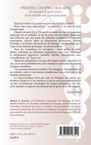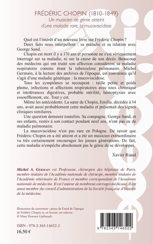Chopin est mort il y a 170 ans et personne ne s'est sérieusement interrogé sur sa maladie, ni sur la cause de son décès. Beaucoup de médecins considèrent sa maladie respiratoire comme étant la tuberculose pulmonaire. Michel Germain, à la lecture des archives de l'époque, est convaincu qu'il s'agit d'une maladie génétique : la mucoviscidose. Tous les symptômes se recoupent : taille petite et poids plume, infections et affections respiratoires avec toux chronique et intolérances digestives, probable stérilité, hémoptysies avec essoufflement, etc. Tout y est, même ses antécédents familiaux.