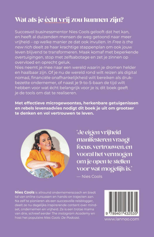 Succesvol businessmentor Nies Cools gelooft dat het kan, en heeft al duizenden mensen de weg getoond naar meer vrijheid - op welke manier ze dat ook invullen. In Free is the new rich deelt ze haar krachtige stappenplan om ook jouw leven blijvend te transformeren. Maak komaf met beperkende overtuigingen, stop met zelfsabotage en zet je zinnen op overvloed en oprecht geluk.