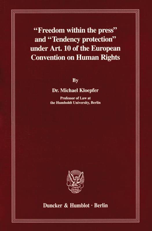 Article 10 of the European Convention on Human Rights protects the freedom of expression and information and, therewith, also the freedom of the press on an European level. Recently there have been, especially at the level of the EC and the Council of Europe, calls to legally entrench a »freedom within the press« («Innere Pressefreiheit«). The aim is to strengthen and formalise the editorial freedom enjoyed by editors and journalists. A conflict exists between these efforts and the protection that owners enjoy in determining what their enterprises publish and what political viewpoints are expressed. A particular manifestation of this problem is the »tendency protection« («Tendenzschutz«) available to owners of press and media enterprises. According to this the right of co-determination normally available to employees in the Works Council does not apply to employees in press and media enterprises. The present volume examines the question whether the efforts to entrench a freedom within the press are consistent with Article 10 of the European Convention on Human Rights. In this regard special attention is paid to the guarantees and effects of the European media freedom in relation to companies.