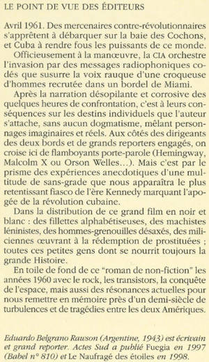 Avril 1961. Des mercenaires contre-révolutionnaires s'apprêtent à débarquer sur la baie des Cochons, et Cuba à rendre fous les puissants de ce monde. Officieusement à la manoeuvre, la CIA orchestre l'invasion par des messages radiophoniques codés que susurre la voix rauque d'une croqueuse d'hommes recrutée dans un bordel de Miami. Après la narration désopilante et corrosive des quelques heures de confrontation, c'est à leurs conséquences sur les destins individuels que l'auteur s'attache, sans aucun dogmatisme, mêlant personnages imaginaires et réels. Aux côtés des dirigeants des deux bords et de grands reporters engagés, on croise ici de flamboyants porte-parole (Hemingway, Malcolm X ou Orson Welles...). Mais c'est par le prisme des expériences anecdotiques d'une multitude de sans-grade que nous apparaîtra le plus retentissant fiasco de l'ère Kennedy marquant l'apogée de la révolution cubaine. Dans la distribution de ce grand film en noir et blanc : des fillettes alphabétiseuses, des machistes léninistes, des hommes-grenouilles désaxés, des mili-ciennes oeuvrant à la rédemption de prostituées ; toutes ces petites gens dont se nourrit toujours la grande Histoire. En toile de fond de ce "roman de non-fiction" les années 1960 avec le rock, les transistors, la conquête de l'espace, mais aussi des résonances actuelles pour nous remettre en mémoire près d'un demi-siècle de turbulences et de tragédies entre les deux Amériques.
