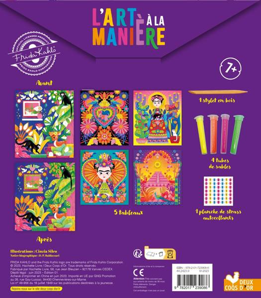 Découvre dans cette pochette tout le nécessaire pour réaliser 5 tableaux inspirés des œuvres de Frida Kahlo. En suivant le mode d’emploi, il suffit de déposer les paillettes et les strass sur les différents tableaux à l’aide des éléments fournis.