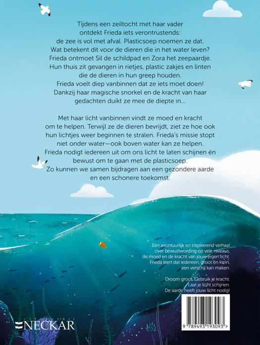 Met haar licht vanbinnen vindt ze moed en kracht om te helpen. Terwijl ze de dieren bevrijdt, ziet ze hoe ook hun lichtjes weer beginnen te stralen. Frieda’s missie stopt niet onder water — ook boven water kan ze helpen. Frieda nodigt iedereen uit om ons licht te laten schijnen én bewust om te gaan met de plasticsoep. Zo kunnen we samen bijdragen aan een gezondere aarde en een schonere toekomst.