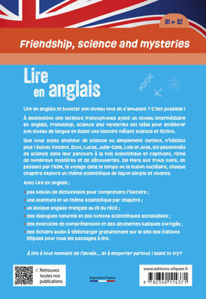 À destination des lecteurs francophones ayant un niveau intermédiaire en anglais (B1), Amitié, science et mystères.Friendship, science and mysteries est un ouvrage idéal pour réviser son vocabulaire, améliorer son niveau de langue tout en lisant une histoire riche d’aventures et en s’amusant.
