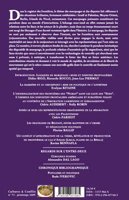 Dans le registre des frontières, le thème des marquages et des disputes fait référence à des situations brûlantes, fortement médiatisées : Israël et Palestine, Moyen-Orient, Berlin, Irlande du Nord, notamment. Ce numéro cherche à analyser le paradoxe intrinsèque des dispositifs de marquage, la profonde relation d'asymétrie qu'ils engendrent, ainsi que les liens étroits que ceux-ci entretiennent avec les technologies de contrôle qui cherchent sans cesse à prévenir, à anticiper, à transformer le futur des flux en futur antérieur.