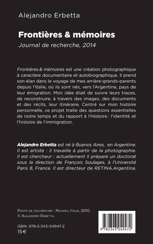 Frontières & mémoires est une création photographique à caractère documentaire et autobiographique. Il prend son élan dans le voyage de mes arrière-grands-parents depuis l'Italie, où ils sont nés, vers l'Argentine, pays de leur émigration. Mon idée était de suivre leurs traces, de reconstruire, à travers des images, des documents et des récits, leur itinéraire. Centré sur mon histoire personnelle, ce projet traite des questions essentielles de notre temps et du rapport à l'Histoire : l'identité et l'histoire de l'immigration.