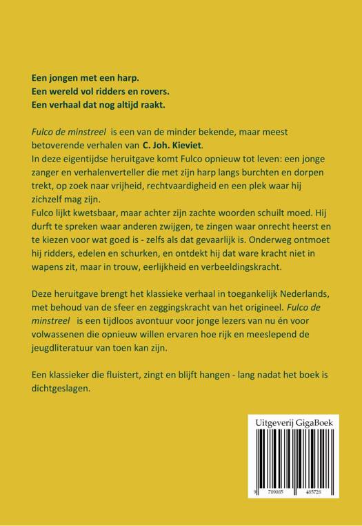 Een jongen met een harp. Een wereld vol ridders en rovers. Een verhaal dat nog altijd raakt. Fulco de minstreel is een van de minder bekende, maar meest betoverende verhalen van C. Joh. Kieviet. In deze eigentijdse heruitgave komt Fulco opnieuw tot leven: een jonge zanger en verhalenverteller die met zijn harp langs burchten en dorpen trekt, op zoek naar vrijheid, rechtvaardigheid en een plek waar hij zichzelf mag zijn. Fulco lijkt kwetsbaar, maar achter zijn zachte woorden schuilt moed. Hij durft te spreken waar anderen zwijgen, te zingen waar onrecht heerst en te kiezen voor wat goed is - zelfs als dat gevaarlijk is. Onderweg ontmoet hij ridders, edelen en schurken, en ontdekt hij dat ware kracht niet in wapens zit, maar in trouw, eerlijkheid en verbeeldingskracht. Deze heruitgave brengt het klassieke verhaal in toegankelijk Nederlands, met behoud van de sfeer en zeggingskracht van het origineel. Fulco de minstreel is een tijdloos avontuur voor jonge lezers van nu én voor volwassenen die opnieuw willen ervaren hoe rijk en meeslepend de jeugdliteratuur van toen kan zijn. Een klassieker die fluistert, zingt en blijft hangen - lang nadat het boek is dichtgeslagen.