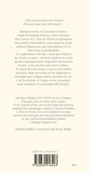 Les citations réunies, toutes extraites des carnets de L’État de Poésie et regroupées sous forme d’Abécédaire, sont autant de petits cailloux blancs pour qui veut explorer la vie dans toute sa profondeur. Leur lecture revient à quitter les voies du divertissement pour emprunter des sentiers d’arête, à mi-chemin entre ciel et abîme. Ces aphorismes sont écrits avec les « mots qui viennent de l’Autre en moi » : s’ils sont des fulgurances, c’est qu’ils traversent un homme capable d’attraper au vol des paroles vibrantes et vivantes et de nous les tendre. Une fois sous nos yeux, à l’arrêt, nous reconnaissons que nous avions été traversés par ces mêmes vérités subtiles, parfois subversives. Mais sans l’art du philosophe et poète, elles nous auraient échappé.