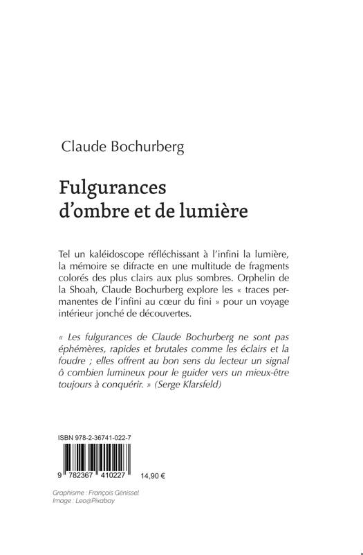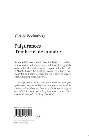 Tel un kaléidoscope réfléchissant à l'infini la lumière, la mémoire se difracte en une multitude de fragments colorés des plus clairs aux plus sombres. Orphelin de la Shoah, Claude Bochurberg explore les « traces permanentes de l'infini au coeur du fini » pour un voyage intérieur jonché de découvertes.