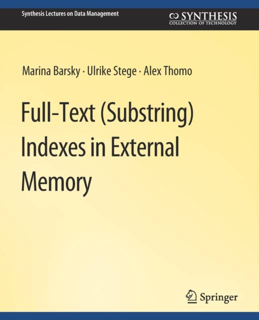 Nowadays, textual databases are among the most rapidly growing collections of data. Some of these collections contain a new type of data that differs from classical numerical or textual data. These are long sequences of symbols, not divided into well-separated small tokens (words). The most prominent among such collections are databases of biological sequences, which are experiencing today an unprecedented growth rate. Starting in 2008, the "1000 Genomes Project" has been launched with the ultimate goal of collecting sequences of additional 1,500 Human genomes, 500 each of European, African, and East Asian origin. This will produce an extensive catalog of Human genetic variations. The size of just the raw sequences in this catalog would be about 5 terabytes. Querying strings without well-separated tokens poses a different set of challenges, typically addressed by building full-text indexes, which provide effective structures to index all the substrings of the given strings. Since full-text indexes occupy more space than the raw data, it is often necessary to use disk space for their construction. However, until recently, the construction of full-text indexes in secondary storage was considered impractical due to excessive I/O costs. Despite this, algorithms developed in the last decade demonstrated that efficient external construction of full-text indexes is indeed possible. This book is about large-scale construction and usage of full-text indexes. We focus mainly on suffix trees, and show efficient algorithms that can convert suffix trees to other kinds of full-text indexes and vice versa. There are four parts in this book. They are a mix of string searching theory with the reality of external memory constraints. The first part introduces general concepts of full-text indexes and shows the relationships between them. The second part presents the first series of external-memory construction algorithms that can handle the construction of full-text indexes for moderately large strings in the order of few gigabytes. The third part presents algorithms that scale for very large strings. The final part examines queries that can be facilitated by disk-resident full-text indexes. Table of Contents: Structures for Indexing Substrings / External Construction of Suffix Trees / Scaling Up: When the Input Exceeds the Main Memory / Queries for Disk-based Indexes / Conclusions and Open Problems