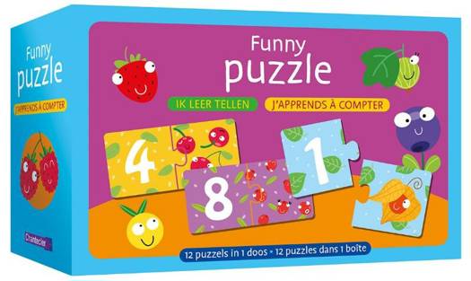 Met deze vrolijke puzzels leren kinderen tellen op een speelse manier: tel het aantal stukken fruit en zoek het bijpassende cijfer! 12 puzzels van 2 stukken in een doos. Geschikt voor kinderen vanaf 3 jaar. Les enfants apprennent à compter tout en s'amusant grâce à ces beaux puzzles : compte le nombre de fruits et cherche le chiffre correspondant. 12 puzzles de 2 pièces dans une boîte. Pour les enfants à partir de 3 ans.