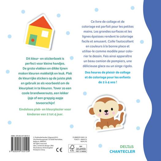 Ce livre de collage et de coloriage est parfait pour les petites mains. Les grandes surfaces et les lignes épaisses rendent le coloriage facile et amusant. Colle l'autocollant en couleurs à la bonne place et utilise-le comme modèle pour colorier le dessin. Fais ainsi apparaître un beau camion de pompiers, une délicieuse glace ou un singe rigolo. Des heures de plaisir de collage et de coloriage pour les enfants de 2 à 4 ans !