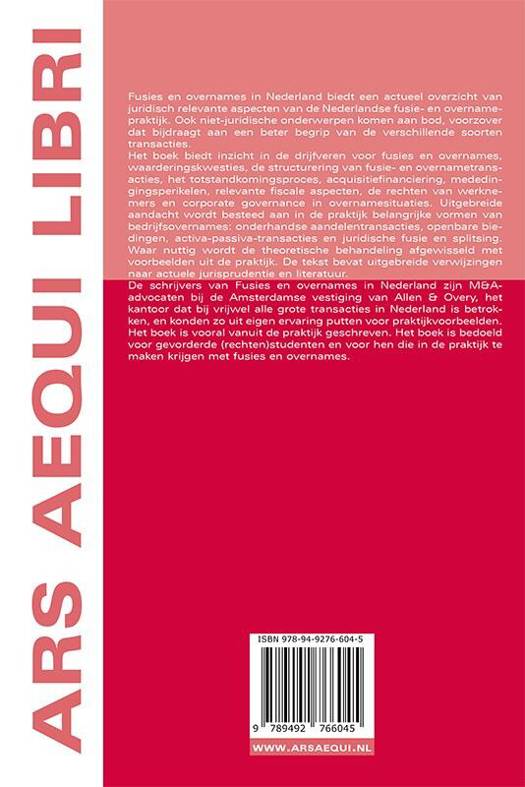 Fusies en overnames in Nederland biedt een actueel overzicht van juridisch relevante aspecten van de Nederlandse fusie- en overnamepraktijk. Ook niet-juridische onderwerpen komen aan bod, voorzover dat bijdraagt aan een beter begrip van de verschillende soorten transacties. Het boek biedt inzicht in de drijfveren voor fusies en overnames, waarderingskwesties, de structurering van fusie- en overnametransacties, het totstandkomingsproces, acquisitiefinanciering, mededingingsperikelen, relevante fiscale aspecten, de rechten van werknemers en corporate governance in overnamesituaties. Uitgebreide aandacht wordt besteed aan in de praktijk belangrijke vormen van bedrijfsovernames: onderhandse aandelentransacties, openbare biedingen, activa-passiva-transacties en juridische fusie en splitsing. Waar nuttig wordt de theoretische behandeling afgewisseld met voorbeelden uit de praktijk. De tekst bevat uitgebreide verwijzingen naar actuele jurisprudentie en literatuur. De schrijvers van Fusies en overnames in Nederland zijn M&A-advocaten bij de Amsterdamse vestiging van Allen & Overy, het kantoor dat bij vrijwel alle grote transacties in Nederland is betrokken, en konden zo uit eigen ervaring putten voor praktijkvoorbeelden. Het boek is vooral vanuit de praktijk geschreven. Het boek is bedoeld voor gevorderde (rechten)studenten en voor hen die in de praktijk te maken krijgen met fusies en overnames.