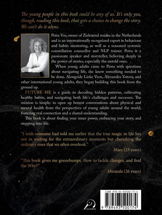 Petra Vos, owner of Zielewind resides in the Netherlands and is an internationally recognized expert in behaviour and habits mentoring, as well as a seasoned systemic constellation counsellor and NLP trainer. Petra is a passionate speaker and storyteller, believing deeply in the power of stories, especially the untold ones. When young adults came to Petra with questions about navigating life, she knew something needed to be done. Alongside Lieke Veen, Alexandra Yotova, and other international young adults, they began building this book from the ground up. FUTURE ME is a guide to decoding hidden patterns, cultivating healthy habits, and navigating both life's challenges and successes. The mission is simple: to open up honest conversations about physical and mental health from the perspectives of young adults around the world, fostering real connection and a shared understanding. This book is about finding your inner power, embracing your story, and stepping into life.
