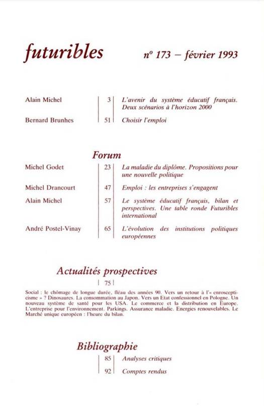 Futuribles 173, février 1993. Le système éducatif français à l'horizon 2000