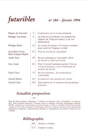 5. Futuribles 184, février 1994. Pour ou contre le revenu minimum, l'allocation universelle ?