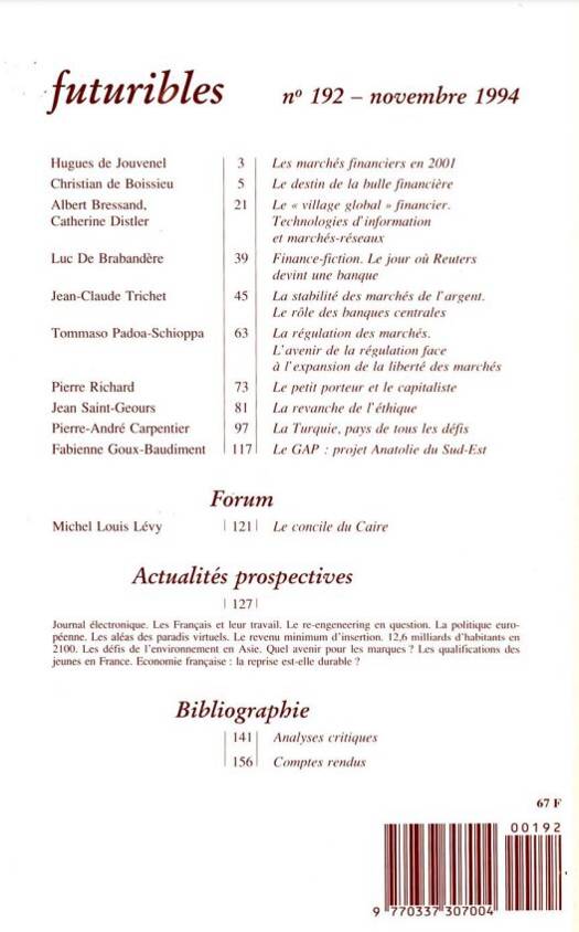 Futuribles 192, novembre 1994. Les marchés financiers en 2001