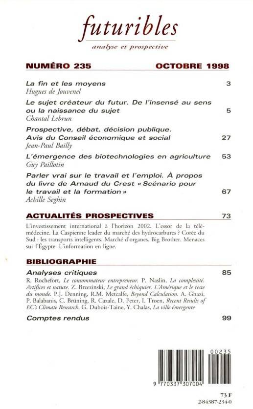 5. Futuribles 235, octobre 1998. Le sujet créateur du futur