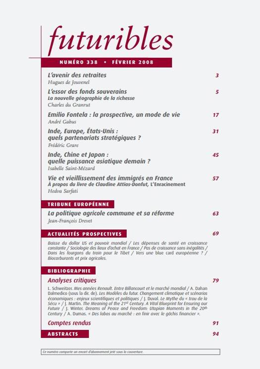 Actualités prospectives - Baisse du dollar US et pouvoir mondial - Les dépenses de santé en croissance constante - Sociologie des lieux d’achat en France - Pas de croissance sans inégalités - Dans les fourgons du train pour le Tibet - Vers une blue card européenne ? - Biocarburants et prix agricoles
