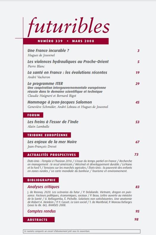 Bibliographie Analyses critiques - J. de Rosnay. 2020. Les scénarios du futur - P. Delalande. Vietnam, dragon en puissance. Facteurs politiques, économiques, sociaux - P. Beau. Lettre ouverte au ministre de la Santé - U. Bellagamba, É. Picholle. Solutions non satisfaisantes. Une anatomie de Robert A. Heinlein - P.-Y. Cusset. Le Lien social - T. de Montbrial, P. Moreau Defarges (sous la dir. de). RAMSES 2008. Comptes rendus