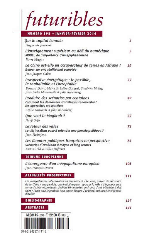 Actualités prospectives - Les comportements alimentaires en mouvement - Le yuan, moyen de puissance de la Chine - Les parklets, une initiative pour repenser la ville - Singapour sans terres - Lieux et pratiques d’achats alimentaires en France - Les tribulations des OGM - Pistes pour le prochain Plan cancer français - Le Brésil, puissance énergétique d’avenir.