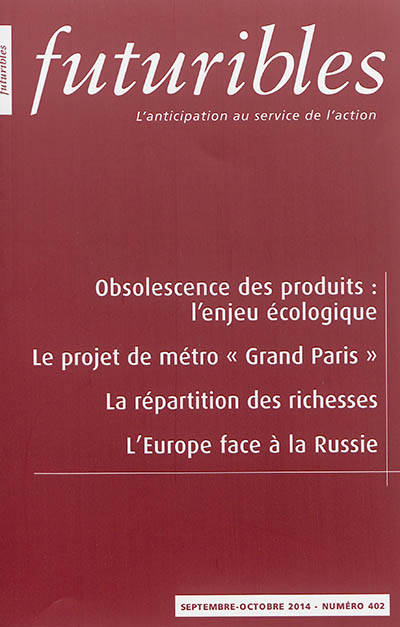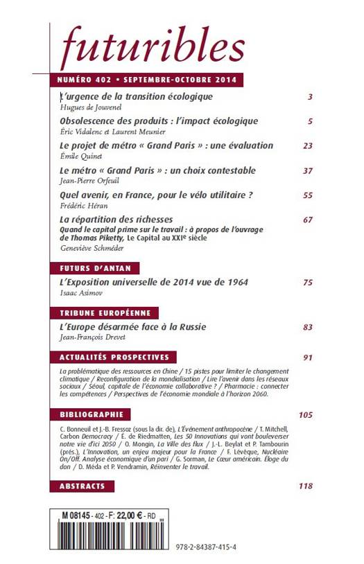 Bibliographie - C. Bonneuil et J.-B. Fressoz (sous la dir. de), L’Événement anthropocène - T. Mitchell, Carbon Democracy - É. de Riedmatten, Les 50 Innovations qui vont bouleverser notre vie d’ici 2050 - O. Mongin, La Ville des flux - J.-L. Beylat et P. Tambourin (prés.), L’Innovation, un enjeu majeur pour la France - F. Lévêque, Nucléaire On/Off. Analyse économique d’un pari - G. Sorman, Le Coeur américain. Éloge du don - D. Méda et P. Vendramin, Réinventer le travail.